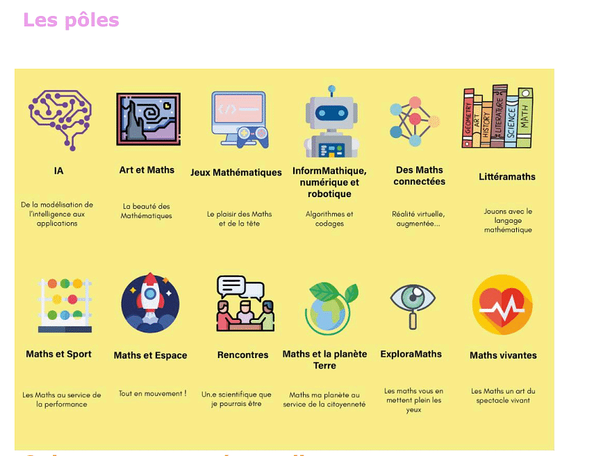 Notre festival est un voyage à travers 12 pôles passionnants, illustrant les liens profonds entre les mathématiques, les arts, la culture, l'informatique, le développement durable, les sciences du numérique etc... Ces domaines ont envahi nos vies professionnelles et personnelles, et notre festival offre une exploration unique de ces intersections fascinantes.