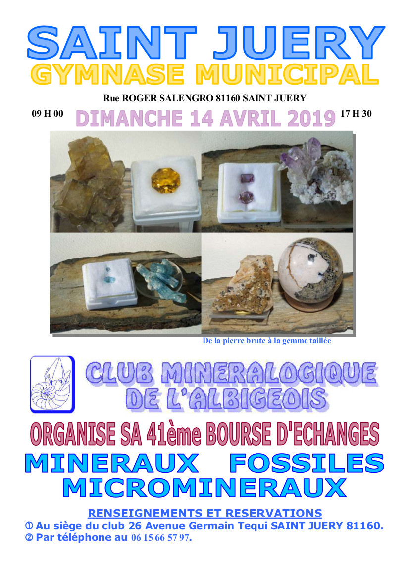 L'association Club minéralogique de l'Albigeois organise sa traditionnelle bourse d'échanges de minéraux, fossiles et micro-minéraux. Une exposition sur le thème "De la pierre brute à la gemme taillée" présentera des réalisations de membres de l'association : sphères minérales, pierres facettées ou cabochons. Une présentation de minéraux fluorescents, une projection de micro-minéraux en relief et une animation sur la taille des pierres fines compléteront cette manifestation se déroulant au gymnase municipal de St-Juéry, rue Roger Salengro.