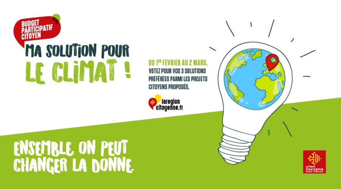 Afin de faire émerger et à mettre en œuvre sur le territoire régional de nouvelles solutions citoyennes en matière d’atténuation et/ou d’adaptation au changement climatique, la Région Occitanie a donc décidé de lancer un Budget Participatif « Ma solution pour le climat ».