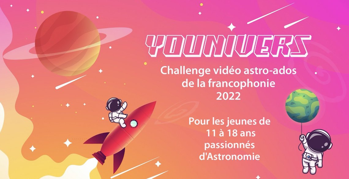La Société Astronomique de France, la Fédération Francophone d’Astronomes Amateurs de Belgique, le NOC IAU de Maurice, les associations Haikintana de Madagascar, Universciel du Liban et TAYA de Tunisie et l’Association Sénégalaise pour la Promotion de l’Astronomie sont heureuses d’annoncer le lancement du 1er challenge vidéo astro-ados de la francophonie Younivers destiné aux jeunes de 11 à 18 ans !