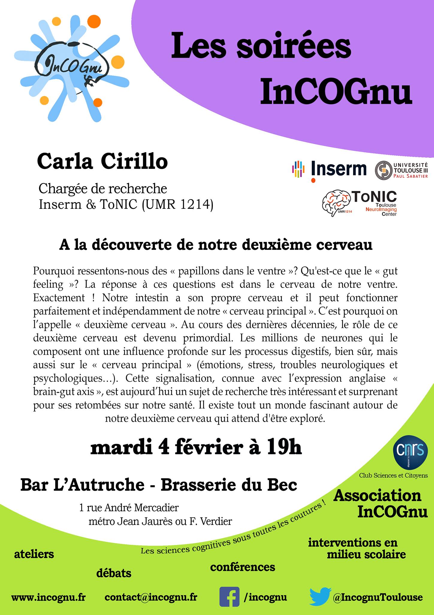 Néanmoins, pour vous faire patienter un peu plus, nous venons de lancer un cycle court de rediffusion vidéo de certaines de nos conférences passées. C’est Carla Cirillo, chargée de recherche au laboratoire ToNIC (Inserm/UPS) qui ouvre le bal. Elle était venue parler en février dernier de notre deuxième cerveau (résumé en pièce jointe). Vous pouvez d'ores et déjà retrouver son intervention sur notre chaine Youtube :