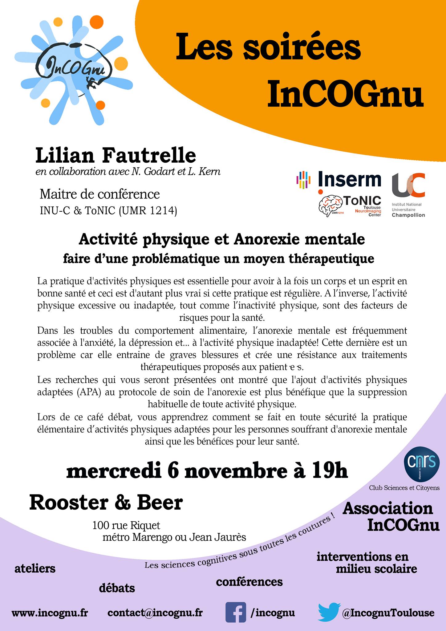 Nous continuons notre cycle de vidéoconférences avec la diffusion de l'intervention de Lilian Fautrelle, maître de conférences à l'Institut National Universitaire Champollion et au laboratoire ToNIC (Inserm/UPS). Il était venu nous parler, en novembre dernier, des bienfaits de l'activité physique avec un focus sur le cas de l'anorexie mentale (résumé en pièce jointe) .