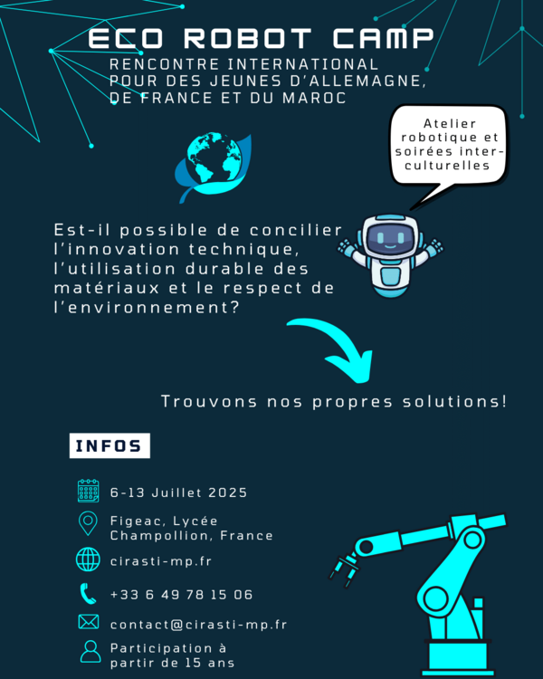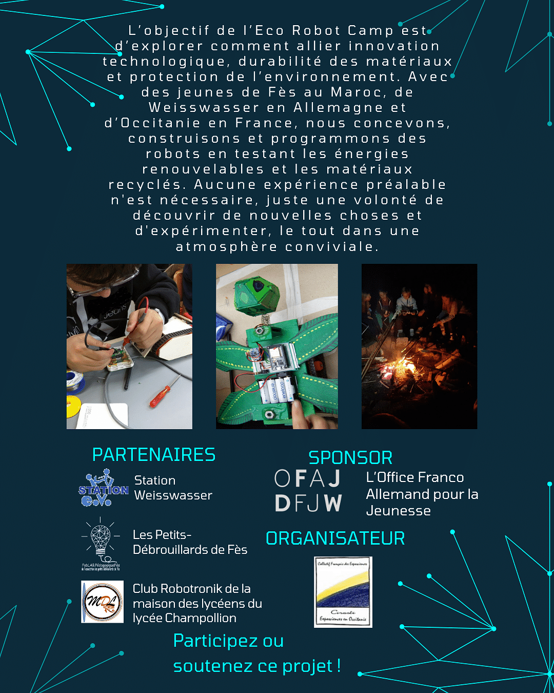 En lien avec Les Petits-Débrouillards de Fès au Maroc et la Station Weißwasser en Allemagne, nous vous proposons une aventure scientifique passionnante : un séjour d’une semaine pour construire votre propre robot et vivre un échange interculturel unique !