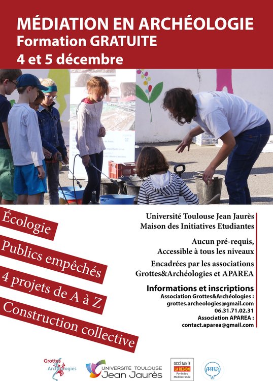 Les associations Grottes&Archéologies et APAREA proposent une formation GRATUITE de médiation en archéologie. Cette année, les stagiaires développeront de A à Z un projet à destination des publics dits empêchés : personnes en situation de handicap et Protection Judiciaire de la Jeunesse.