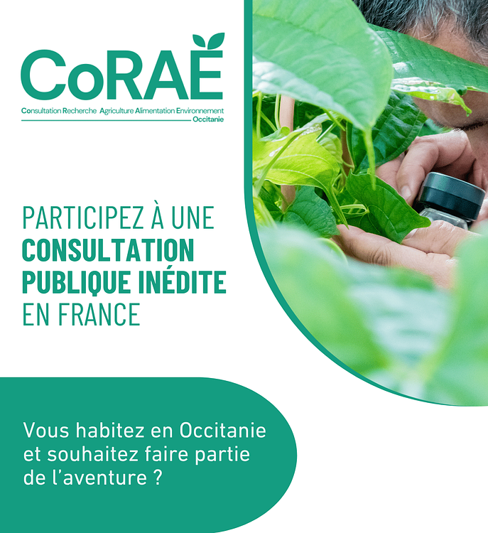 INRAE et la Chambre régionale d'agriculture Occitanie lancent CoRAE, Consultation Recherche Agriculture Alimentation Environnement, une initiative inédite pour faire dialoguer femmes et hommes, chercheurs, agriculteurs, acteurs économiques, citoyens et décideurs publics autour des grands défis agricoles et alimentaires de notre région. Cette démarche vise à renforcer l’impact des recherches, de la formation et de l'innovation sur le terrain.