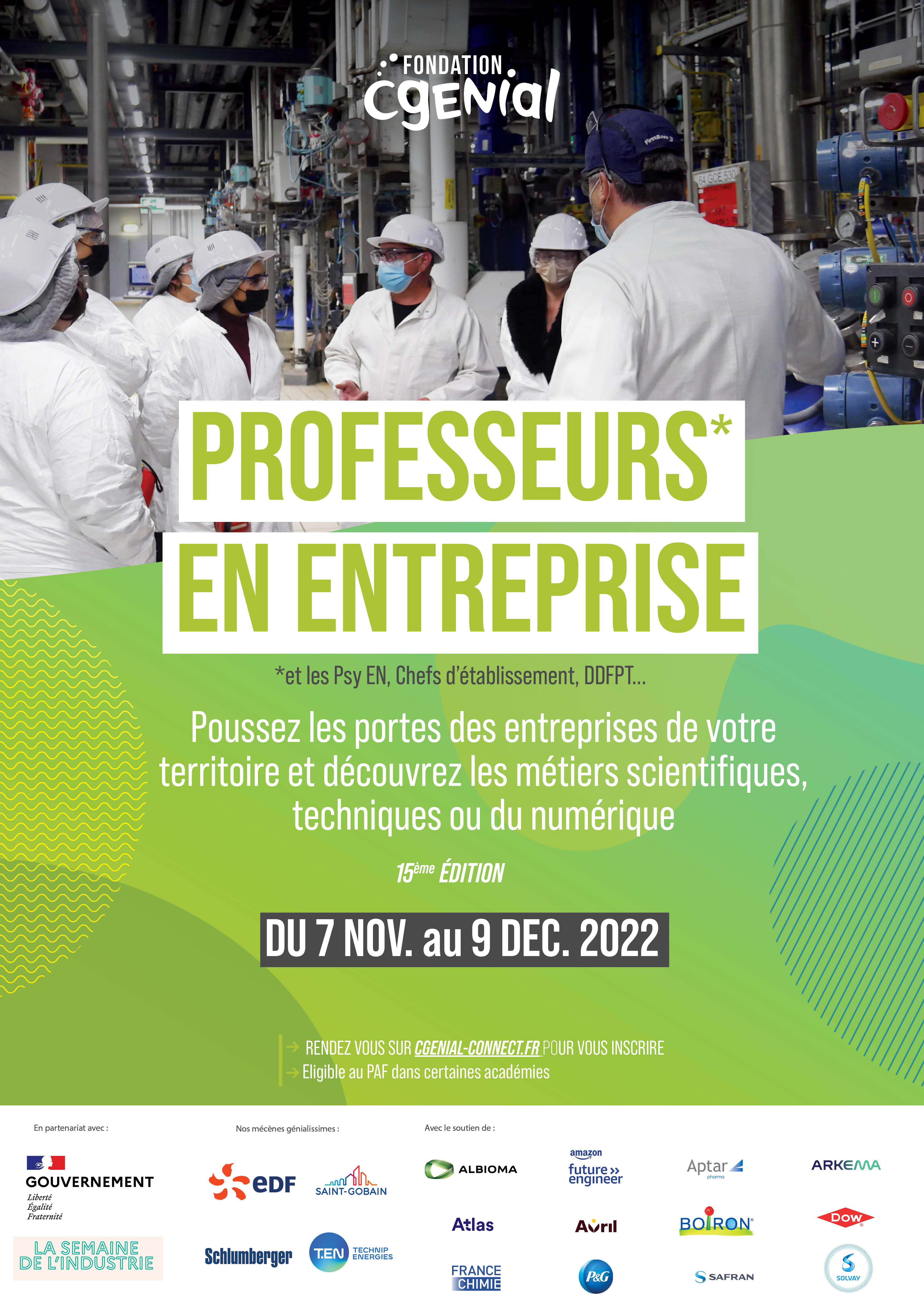 La fondation CGénial organise maintenant depuis plusieurs années des visites en entreprise pour les professeurs afin de les sensibiliser aux métiers scientifiques et industriels, pour qu'ils puissent à leur tour présenter leur expérience auprès de leurs élèves. Vous pouvez retrouver plus de détails sur l'action Professeurs en entreprise ici.