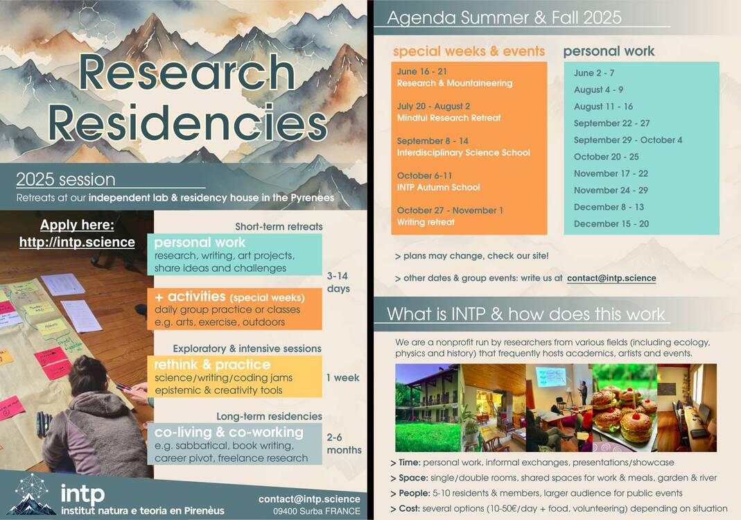 L’Institut Natura e Teoria en Pirenèus (http://intp.science) a le plaisir de partager son calendrier d’activités pour le second semestre 2025, qui inclut des écoles et des résidences de recherche scientifique et artistique.