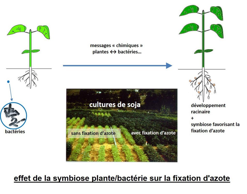 Véréna Poinsot, directeur de recherches au laboratoire des IMRCP (CNRS Toulouse), travaille sur les molécules échangées par les bactéries, les champignons et les plantes pour « discuter ». Ces messagers chimiques sont à l’origine des processus symbiotiques. En identifiant les morceaux d’ADN qui codent pour ces messagers chimiques (pour l’émission et la réception du message), on peut envisager de les inclure dans le matériel génétique d’autres plantes pour les aider à communiquer et mettre en place des associations symbiotiques avec les bactéries. Il en résultera un apport accru d’azote et donc un moindre besoin en azote…