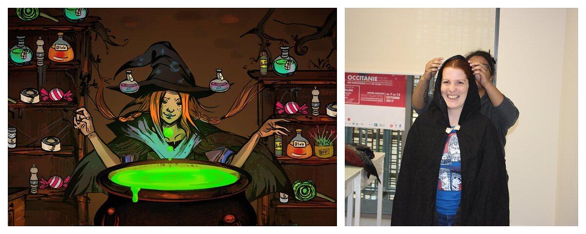 Le jeu met en scène une fée-sorcière devant son chaudron sous les traits de Claire, la doctorante impliquée dans le projet.