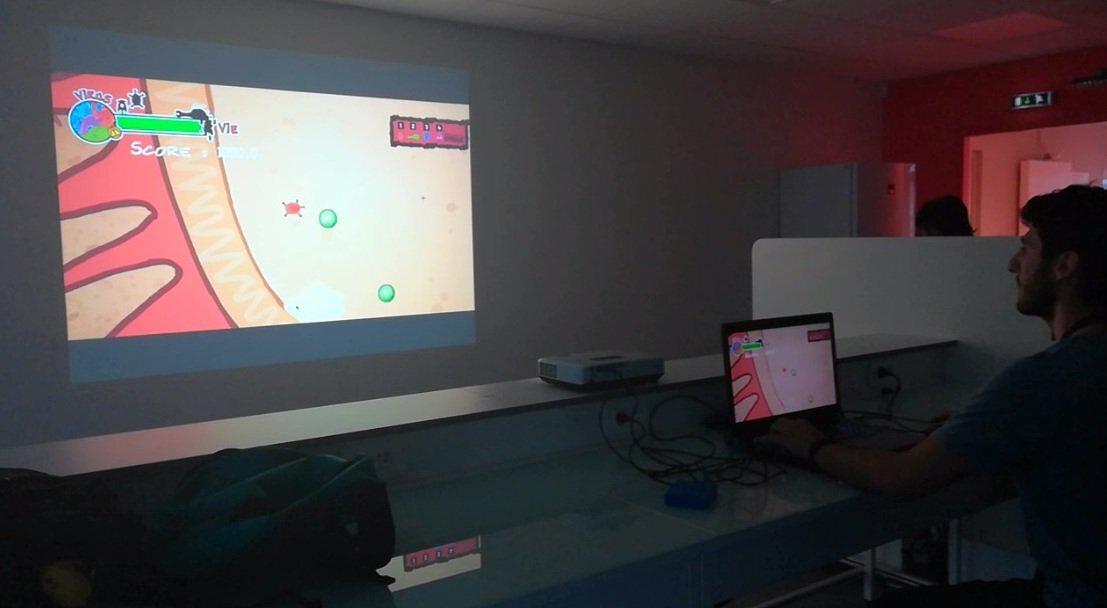 Au cours du jeu, le joueur a le choix d’incarner 4 protéines aux pouvoirs différents : tuer les agents du système immunitaire représentés par de petits fantômes, récolter des boules vertes (la fameuse protéine étudiée par William), former une cavité et multiplier le virus. Les boules vertes permettent au joueur de gagner des points de vie. Lorsque les protéines virales éliminent un agent du système immunitaire, le joueur gagne des points mais il en gagne surtout lorsqu’il parvient à former des cavités et multiplier le virus. Le jeu permet ainsi de découvrir les mécanismes utilisés par le virus Chikungunya pour proliférer.