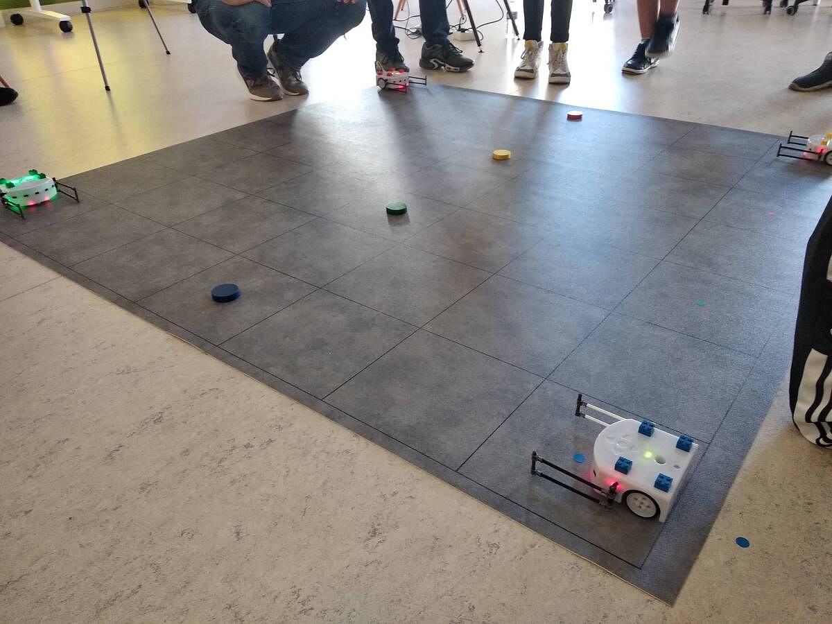Chacune des équipes passe l'une après l'autre, sous l'oeil attentif des concurrents. Les enfants appuient sur le bouton déclencheur de leurs Thymios. Ceux-ci s'élancent sur la piste, sous les encouragements de leurs humains, sauf quelques-uns qui, contre toute attente, ne démarrent pas... Problème de codage ? Mauvaise réinitialisation ? Très vite, un robot de secours est installé à la place du défectueux, pour rattraper le temps perdu. Les visages sont confiants, chaque équipe est sûre de sa victoire. La majorité des Thymios atteignent leur palet respectif et sont prêts à l'amener à la base. Certains manquent leur palet de peu, et d'autres dévient complètement de leur trajectoire ! Le temps imparti permet de recommencer, mais rien à faire, certains robots n'atteignent pas leur palet ou leur base. Il doit y avoir une erreur dans leur programme...