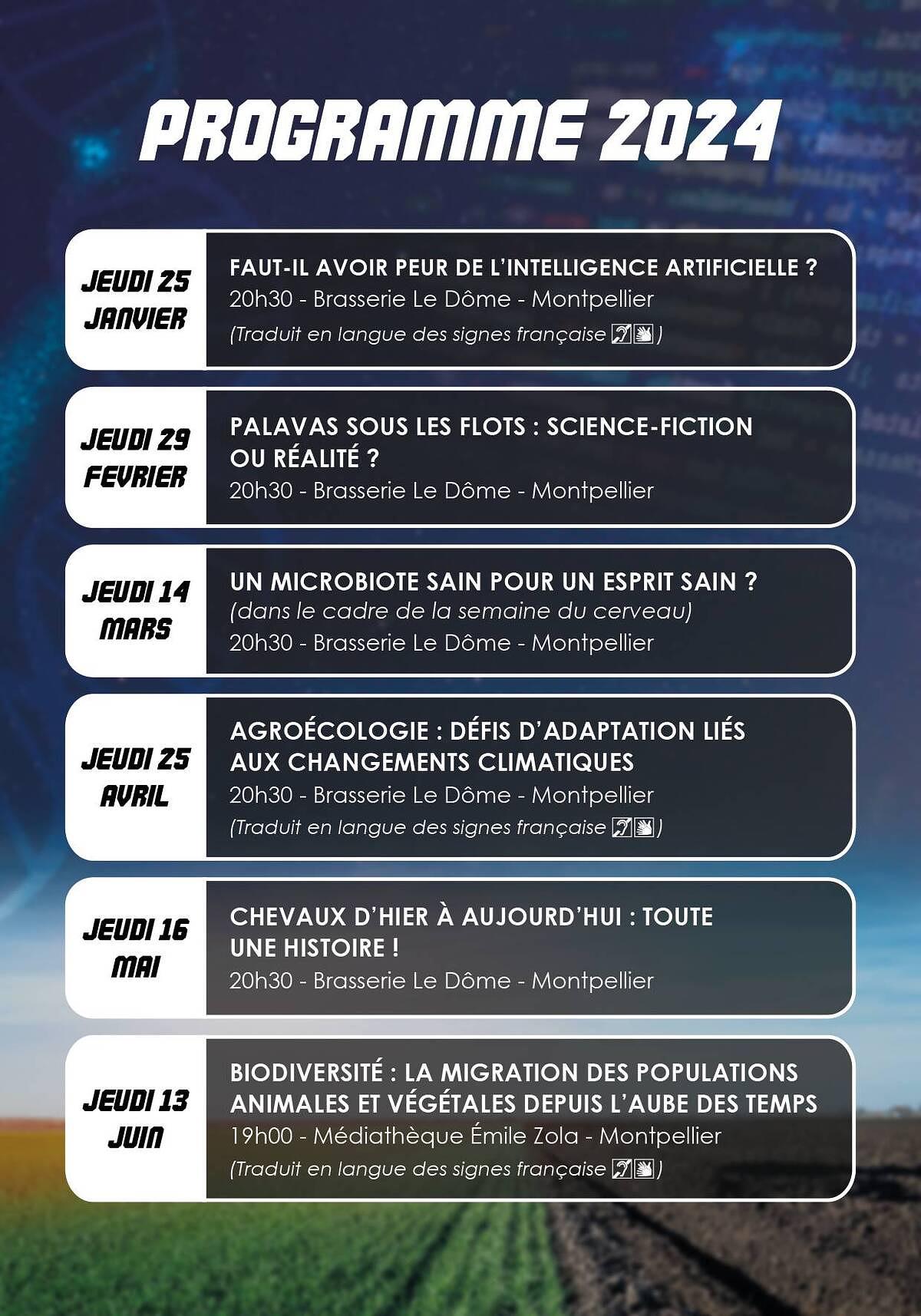 La saison du Bar des sciences est coproduite par les services de culture scientifique de l’UM et leurs partenaires : l’INRAE, l’INSERM et l’IRD.  Elle propose une série de six soirées mixant une diversité de thématiques scientifiques, mais aussi de sujets sociétaux et d’actualité.