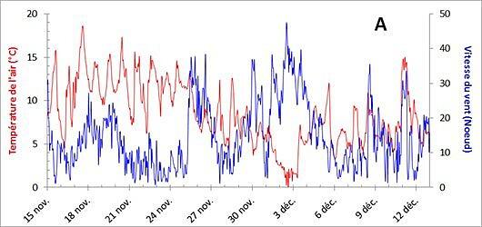 Figure 1A) vitesse horaire du vent (nœud) moyennée sur 5 min. (en bleu) et température de l'air (°C) (en rouge) en novembre et décembre 2017 au point SOLA.