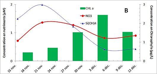 En fait, les épisodes venteux du mois de novembre permettent une augmentation  des concentrations en sels nutritifs dans la couche de surface par des phénomènes de mélange (illustrée par les nitrates et les silicates en figure 1B ; vent du 18 au 21 nov., maximum de nutriments le 21 nov). Ces éléments sont indispensables à la croissance du phytoplancton et, leur quasi absence une grande partie de l'année, limite généralement le développement de ces organismes en milieu marin. En hiver, ce sont les faibles températures et l'effet mécanique d'agitation (turbulences) qui perturbent cette croissance. L'absence de vent jusqu'au 27 novembre est suffisante pour permettre aux microalgues de croître et se diviser. Les épisodes venteux du 27 novembre et du 3 décembre, malgré leur intensité, ne freinent pas la croissance des algues qui consomment les sels nutritifs (figure 1B) et se multiplient jusqu'au 6 décembre en produisant un "bloom hivernal" tout à fait étonnant.