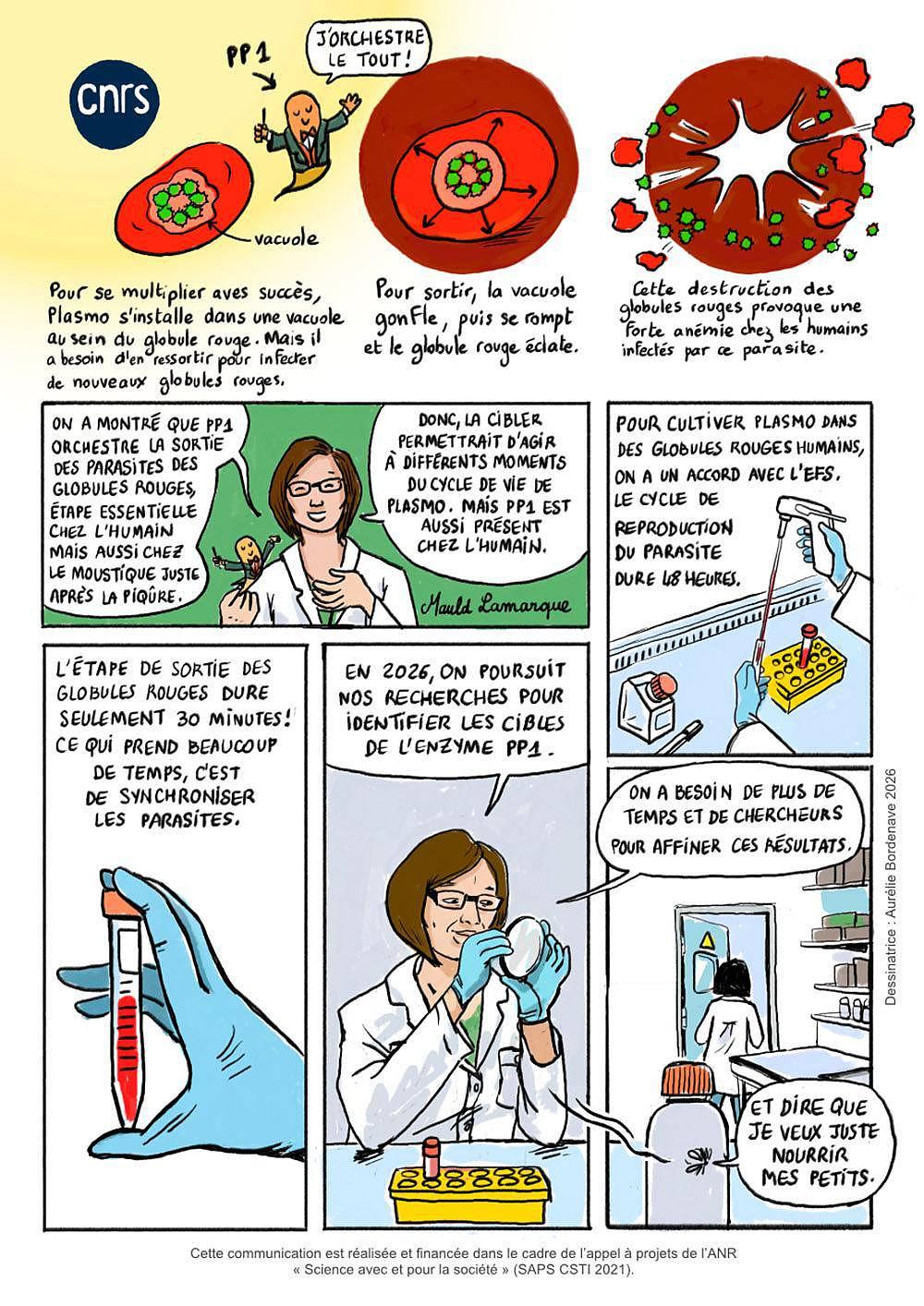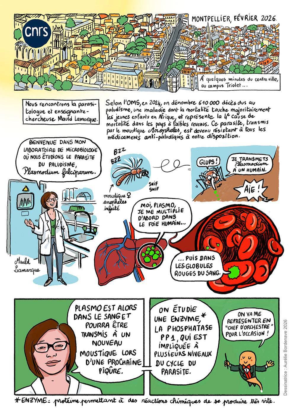 Une équipe de recherche du laboratoire LPHI s'intéresse au rôle de l'enzyme PP1 (phosphatase parasitaire PP1) impliquée à plusieurs niveaux du cycle de vie du parasite Plasmodium falciparum : un espoir pour le développement de futurs antipaludiques ciblant plusieurs stades parasitaires. Découvrez ces recherches à travers les planches illustrées