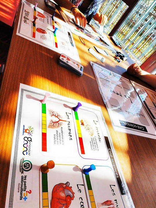 Enfin les enfants ont également pu participer à un jeu de plateau composé de différentes parties du corps humain (muscles, cœur, poumons, cerveau). Ce jeu consiste à préparer au mieux le corps à un possible danger imminent, permettant aux enfants un ancrage des messages clés des séances sur le long terme.