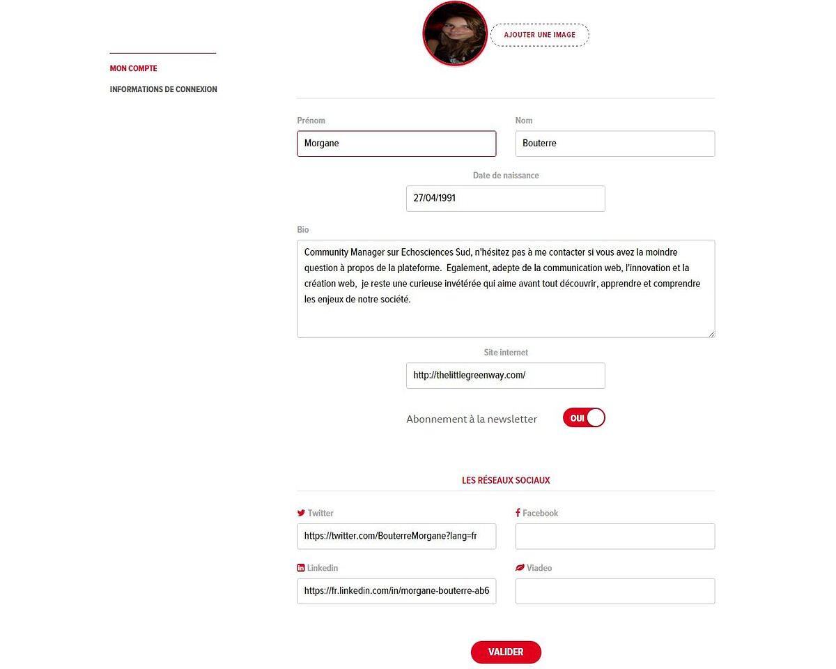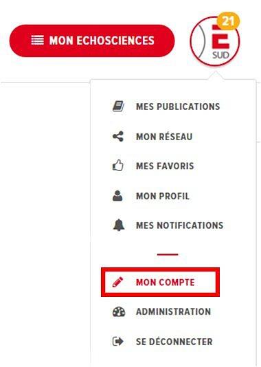 Une fois inscrit sur Echosciences, cliquez sur le cercle en haut à droite de l’interface. Le menu vous permet d’accéder à “mon compte”.