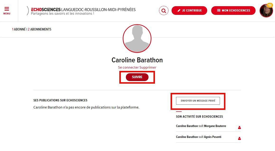 Qu’il s’agisse de recréer, d’élargir votre réseau professionnel ou de découvrir de nouvelles personnes, Echosciences vous permet de suivre des comptes utilisateurs. Pour ce faire, il suffit de cliquer sur le nom de l’auteur d’une publication pour afficher son profil et d’appuyer sur “Suivre”.