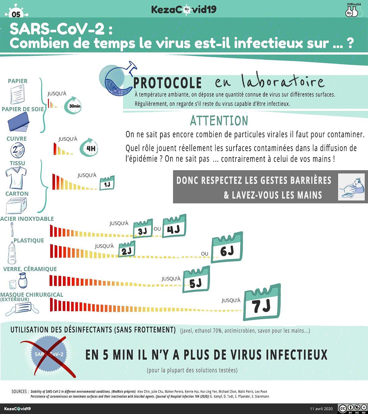 Terrain d'étude du jour : les surfaces. Petite infographie retraçant à ce jour ce que l'on sait de la persistance de ce nouveau virus sur certaines surfaces.