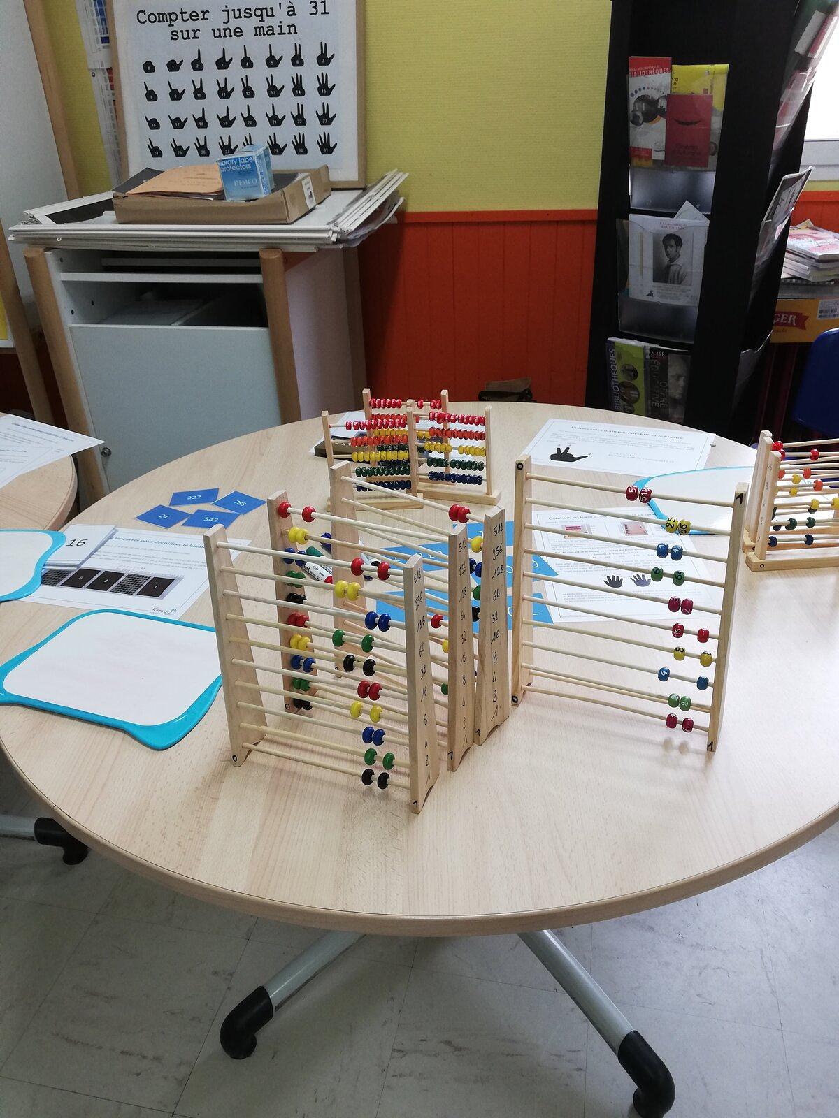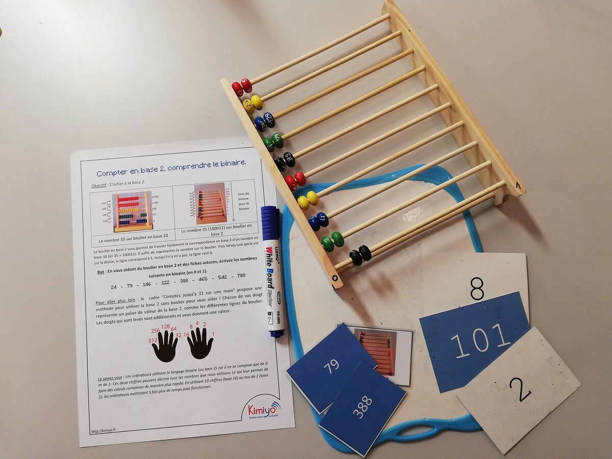 Nous avons fabriqués des bouliers en base 2, afin d'aider nos apprentis informaticiens. Le principe est simple. Il doivent représenter les nombres en système décimal sur le boulier. Puis, ils se retrouvent avec des lignes possédant une bille sur la droite et des lignes sans billes. Enfin, pour trouver la correspondance en binaire, il suffit de lire le boulier, cette fois-ce de haut en bas. Lorsqu'une bille est présente on le lit "1", lorsqu'il n'y a pas de bille on le lit "0". Ainsi chaque nombre en décimal possède un équivalent en binaire, avec une succession de 0 et de 1. Une exemple peut être ? Ca vous aidera à y voir plus clair.