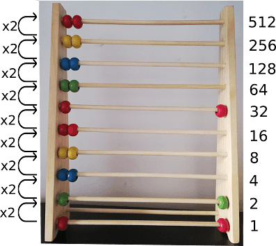 Vous avez ici le nombre 35 représenté sur le boulier (en système binaire puisqu'il n'y a que 2 billes par ligne). Une bille sur la ligne 32, une sur la ligne 2 et une sur la ligne 1, soit 32 + 2 + 1 = 35. Ça va vous suivez ?