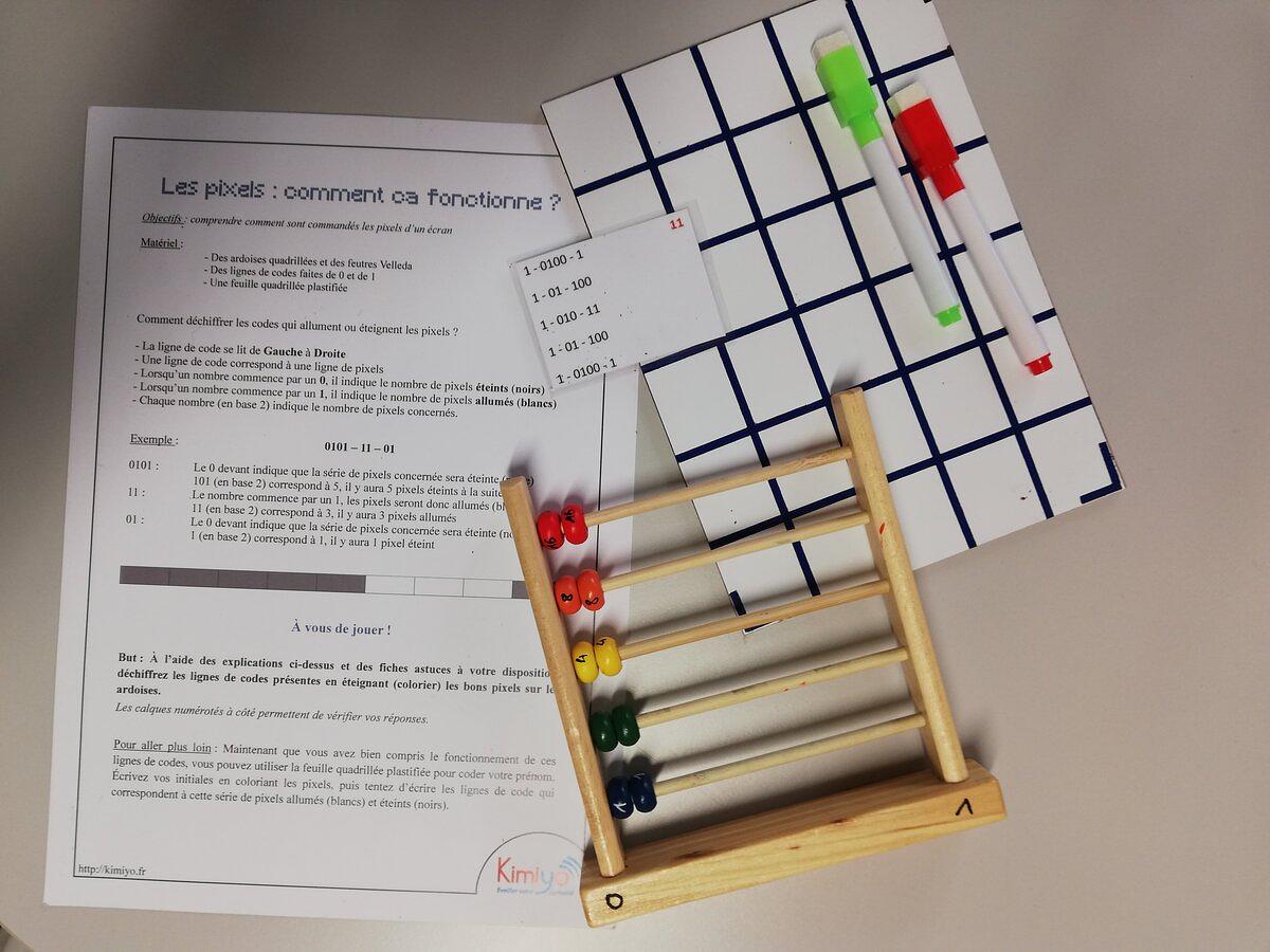 Pour cette troisième mission, nos informaticiens vont devoir décoder des lignes de codes écrites en binaire. Ce faisant, ils sauront quels pixels allumer et quels pixels éteindre afin de faire apparaître des dessins. Pour cela, ils ont à leur disposition des ardoises avec 5 lignes et 6 colonnes de pixels à colorier. Pour s'aider, ils pourront toujours utiliser des bouliers ou leurs doigts. Trois petites choses sont à savoir avant de démarrer.