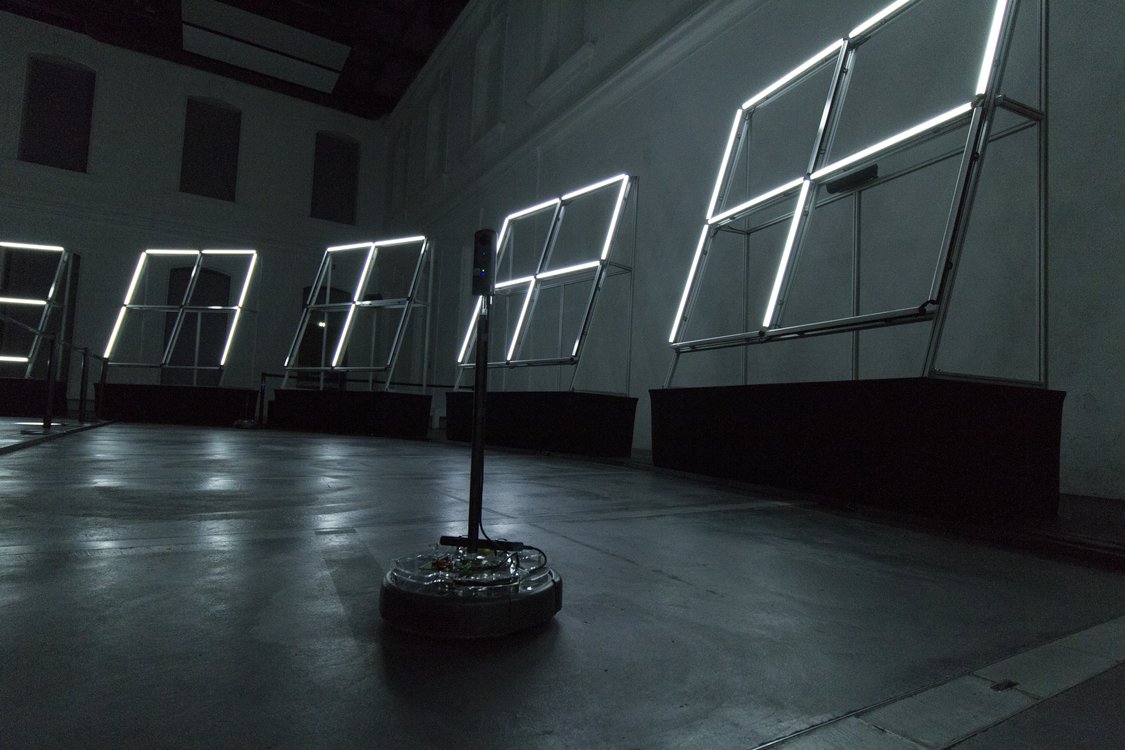 Mais comme souligné par Romain Tardy, il y a toujours un écart entre l’intention de départ du dispositif et les effets qu’il produit finalement. La présence de ces robots offre un nouveau regard sur l’installation. D’un côté, les robots sont clairement séparés des visiteurs. Ils tournent autour de la zone délimitée d’exposition : la frontière entre robots et humains est tangible, chacun est assigné à une surface bien définie où chacun peut se déplacer. D’un autre côté, la présence des robots se fait ressentir justement par cette façon qu’ils ont de se déplacer autour de nous. Le visiteur est observé, puisqu’il est filmé, et même encerclé, et cela pourrait faire penser à une situation de “Big Brother is watching you”. Pourtant, cette potentielle surveillance n’est pas vraiment ressentie. Si le public est attentif au déplacement effectué par les robots, il verra qu’à plusieurs reprises, celui-ci est loin d’être fluide. C’est dû à la jonction entre certaines dalles : à chaque fois que le robot passe par-dessus avec sa caméra, il est légèrement déséquilibré et semble trébucher. Et cette apparente maladresse leur apporte un véritable côté humain, presque une forme de personnalité.