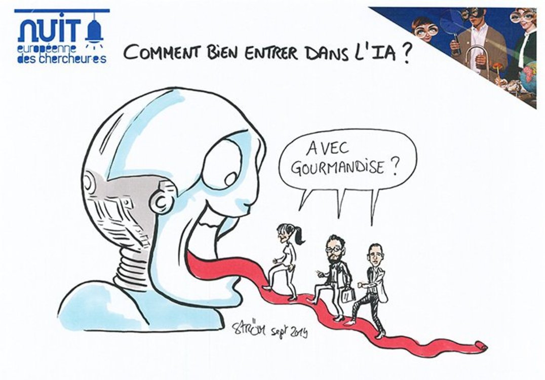 Avec le regard espiègle du dessinateur Ström, retour en dessins des échanges de la table ronde « Intelligence artificielle : comment (bien) préparer notre avenir ? » de la Nuit européenne des chercheur.e.s de Toulouse.