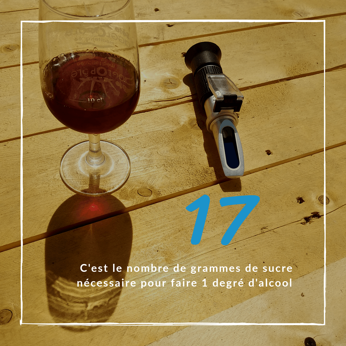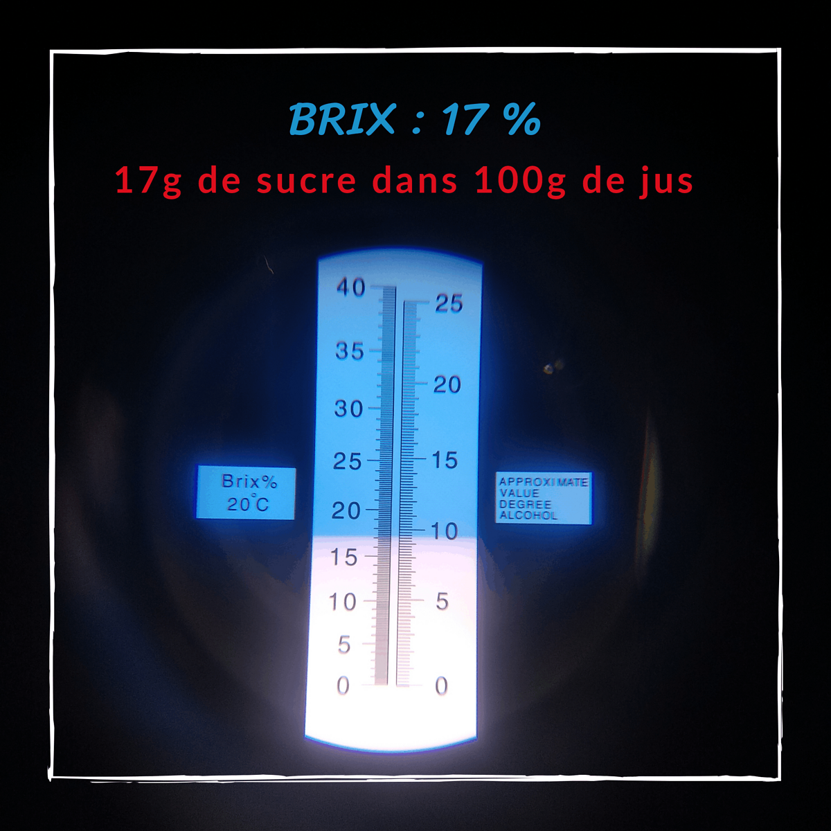 À vos calculettes pour mesurer le potentiel alcoolique de notre jus de raisin (vous avez la réponse sur la photo de notre mesure au réfractomètre ;-) )