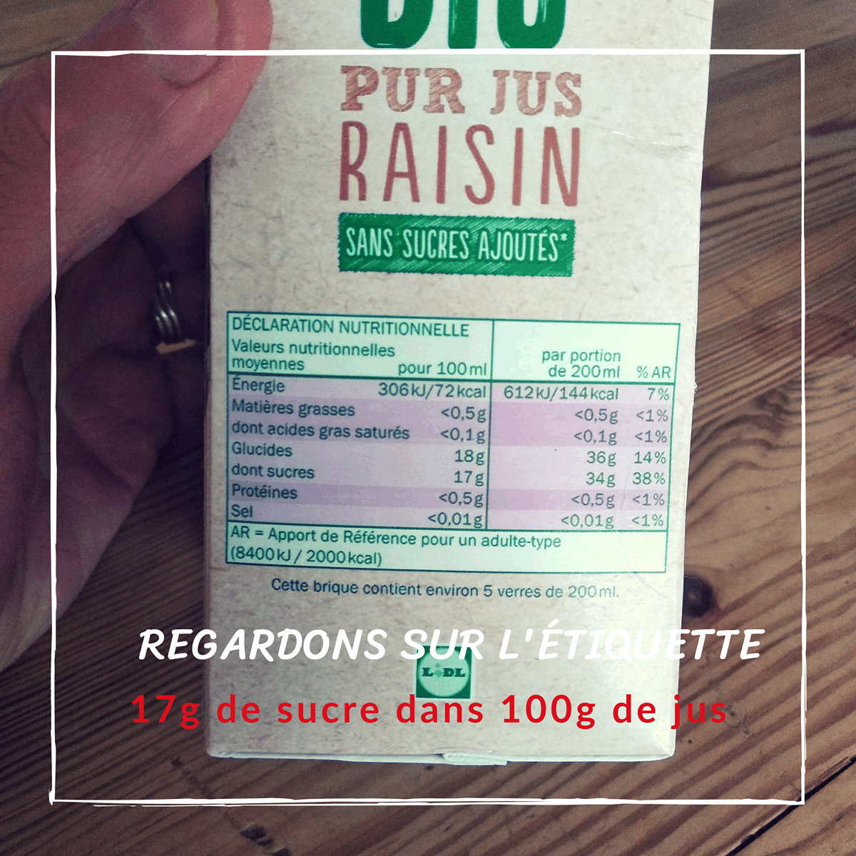 Nous avons donc 17g de sucre pour 100g de jus de raisin...