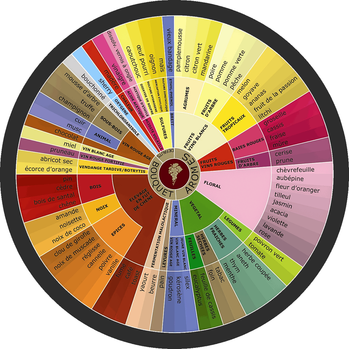 Pour vous aider à les identifier lors de vos prochaines dégustations voici la roue des arômes réalisée par aromaster et disponible sur wikipedia