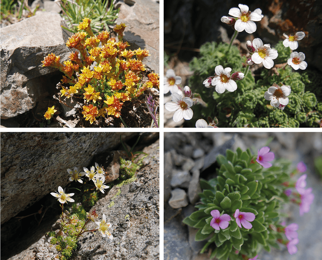 De gauche à droite et de haut en bas : Sedum alpestre, Saxifraga iratiana, Saxifraga bryoïdes et Androsace ciliata © Alexandre Reteau / CBNPMP