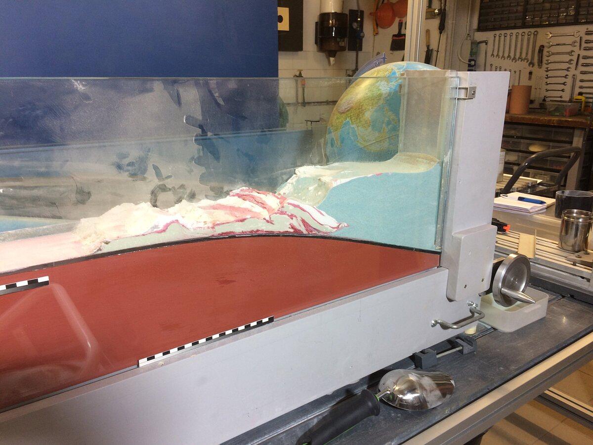 Stéphane Dominguez : Avec ce modèle, on essaye de faire un morceau de chaîne de montagnes. C’est une application très directe puisque ce modèle est lié au bassin tadjik situé en Asie Centrale. Le but est d’observer la structure de la montagne qui va naître. On peut observer au travers de la vitre, plusieurs couches. Chaque couche va représenter une vraie couche qui a été identifiée par forage sur le terrain.
