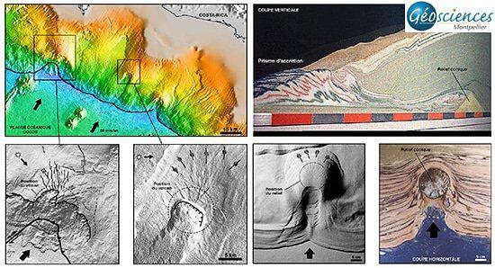 Exemples de terrain (marge du Costa-Rica) et modèles analogiques illustrant la subduction de volcans sous-marins dans une zone de subduction (S. Dominguez, 1998) ©Géosciences Montpellier