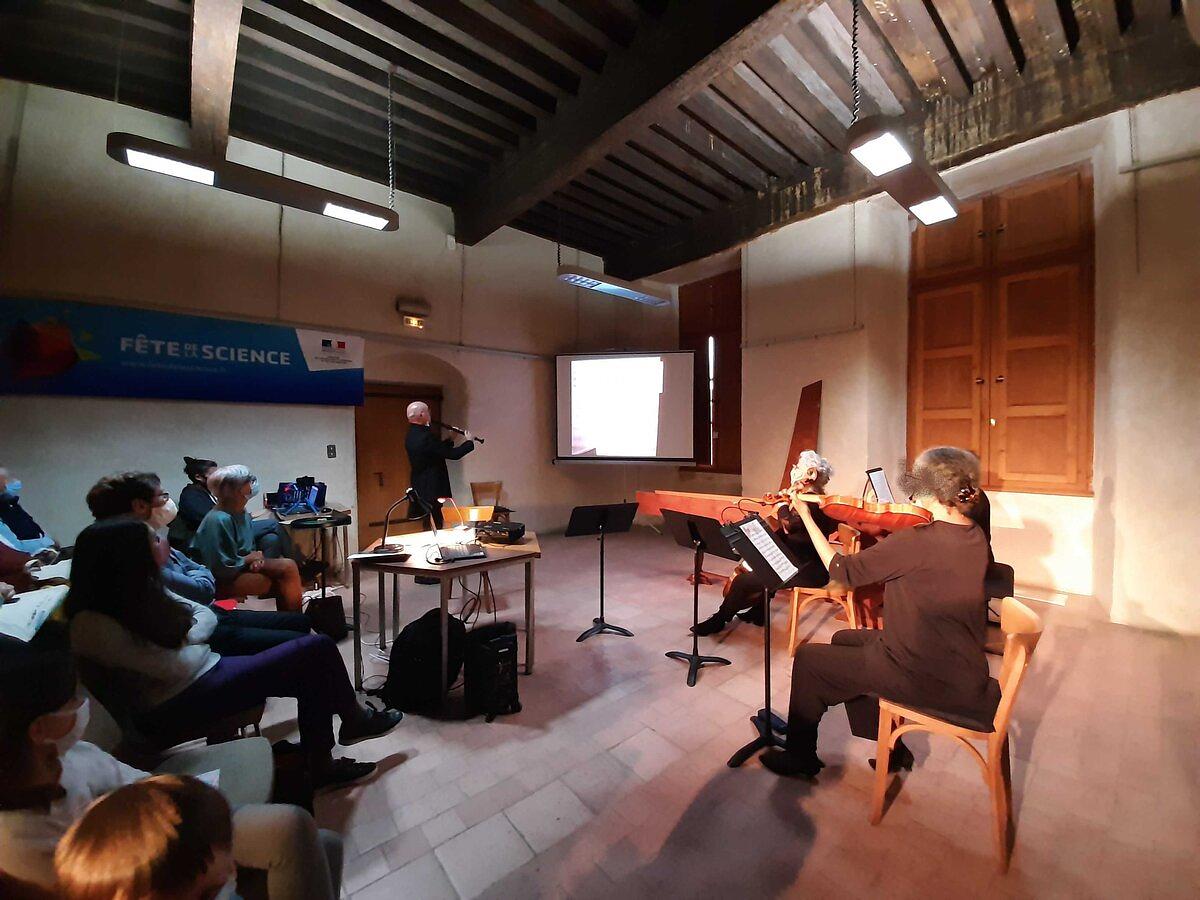 Depuis plusieurs années, l’orchestre Les Passions basé à Montauban et l’association Fermat Science développent une complicité de bon aloi. Chaque année, à la veille de la fête des maths, le rendez-vous est pris. Quatre musiciens des Passions viennent occuper la salle de conférences et, dans ce cadre privilégié, chaque année le plaisir est au rendez-vous. Mais instituer une habitude de la sorte ne suffit pas. Encore faut-il, si on ne veut pas sombrer dans la routine, ajouter un peu de piquant à l’affaire. C’est ainsi, qu’est née l’idée de calquer le thème du concert sur celui de la Fête des maths. C’est une folie, dira-t-on ? Et pourtant ça marche !