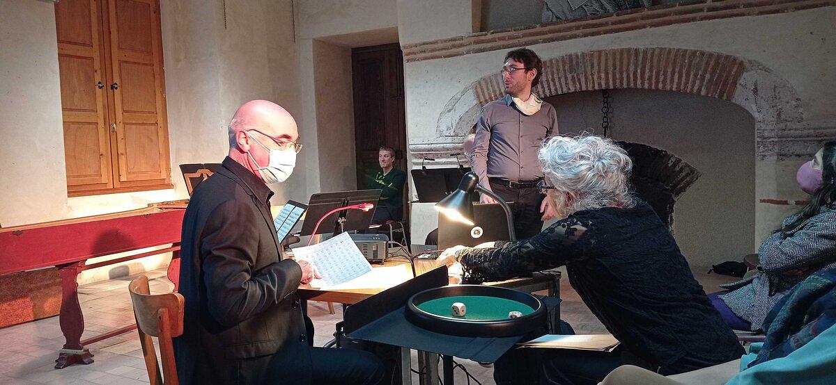 Il a découvert dans les archives de la Mémo, la médiathèque de Montauban, un manuscrit d’origine espagnole explorant un moyen de composition ludique qui associe des lancers de dés à la création de menuets. Un tableau à double entrée comportant 176 mesures différentes numérotées de 1 à 176 a permis, au cours de la soirée, la composition et l’exécution successives, en direct devant le public, de deux partitions à partir de lancers de dés.