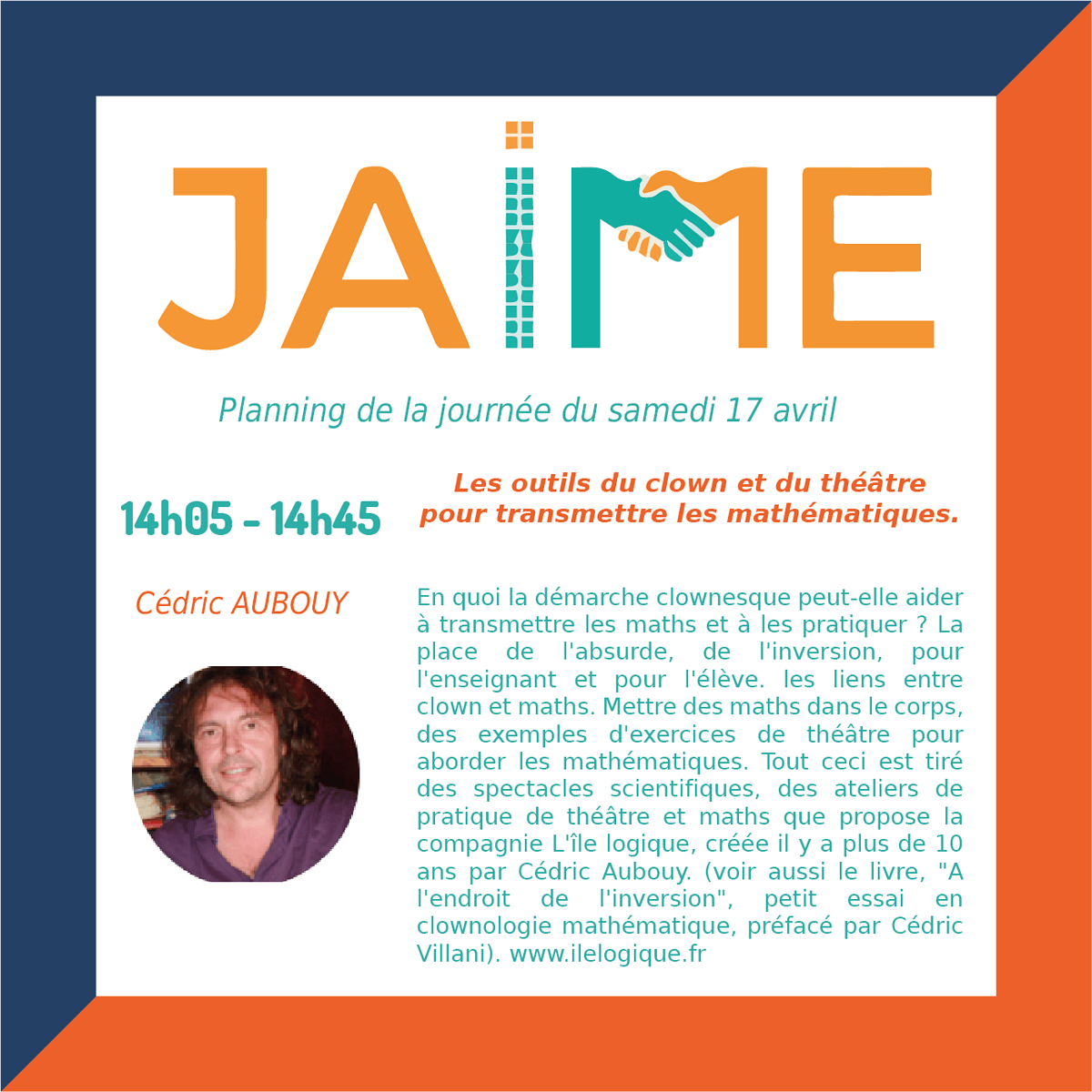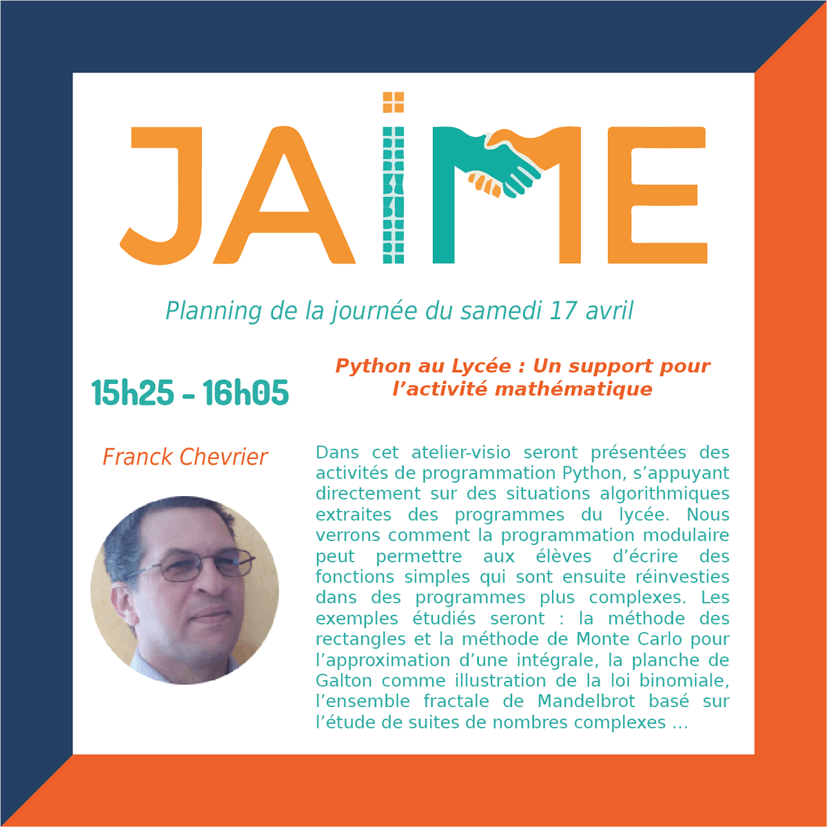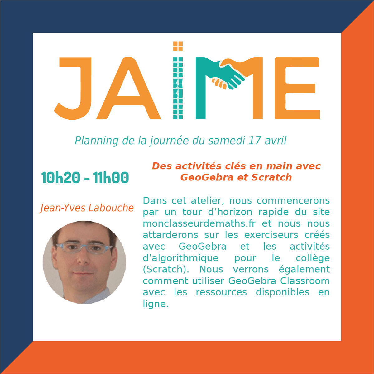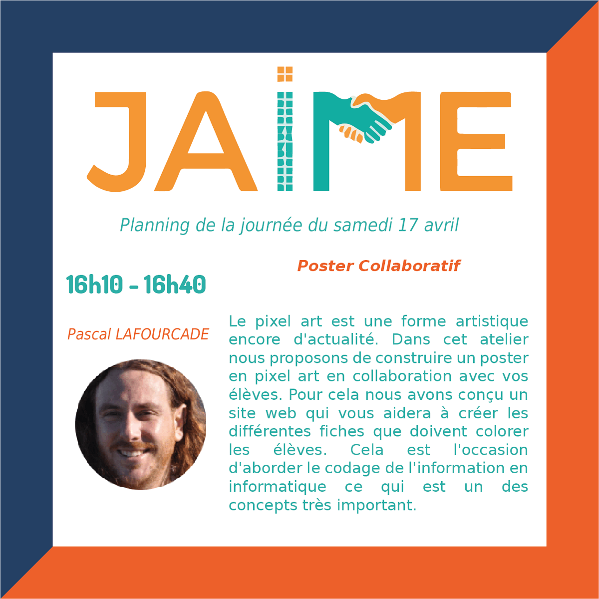 Les journées JAIME (Journées Ateliers Informatiques et Mathématiques pour les Enseignants) auront lieu le samedi 17 avril de 8h30 à 12h30 et de 13h30 à 20h et dimanche 18 avril 9h à 12h35 et de 13h30 à 17h30, pour clore le Festival international « Les maths dans tous leurs états ».