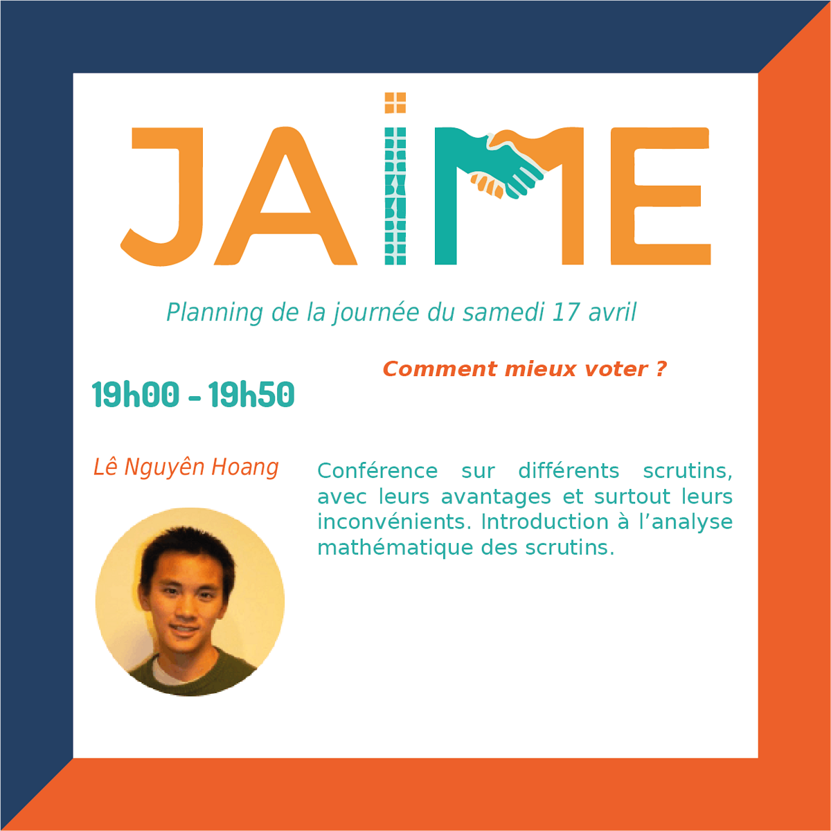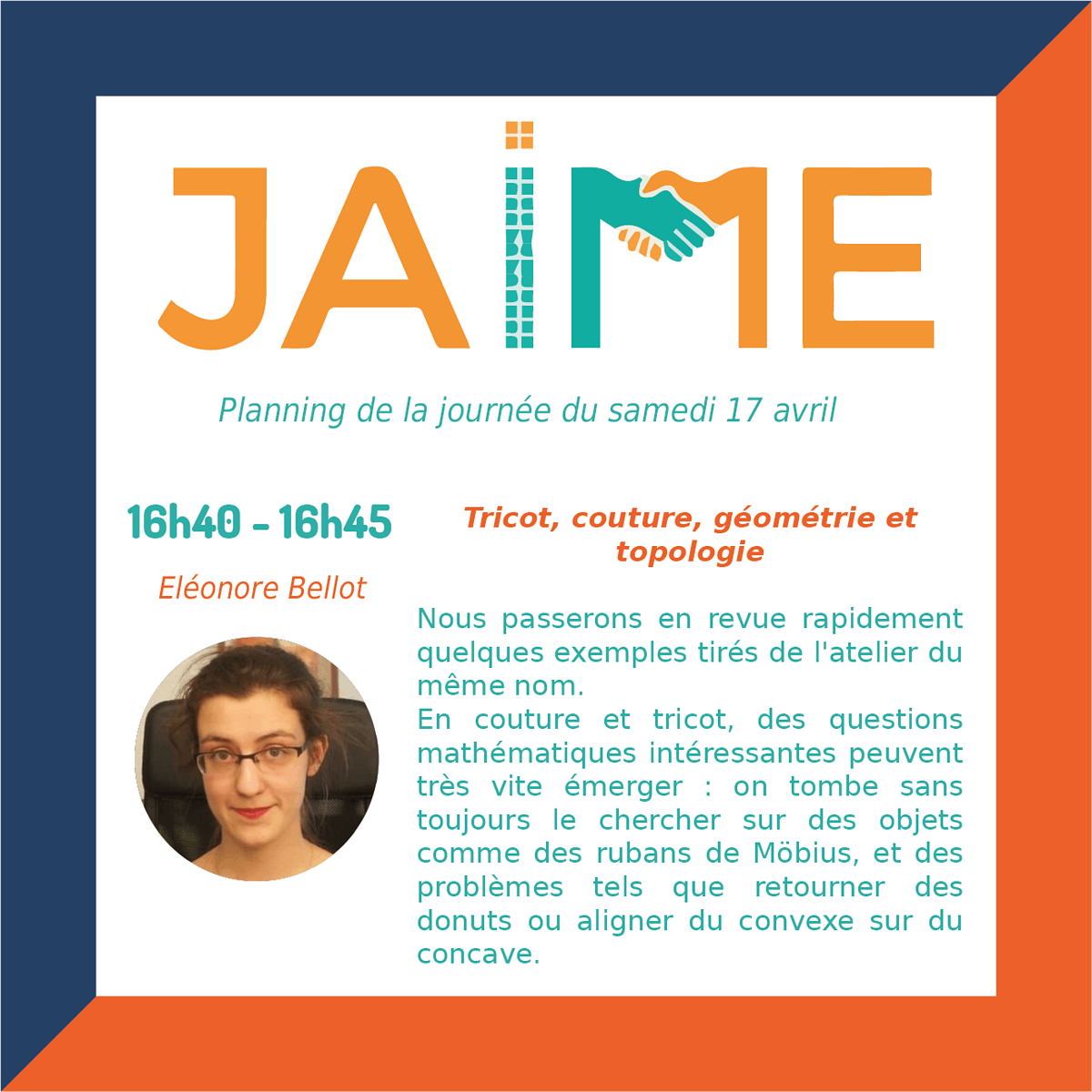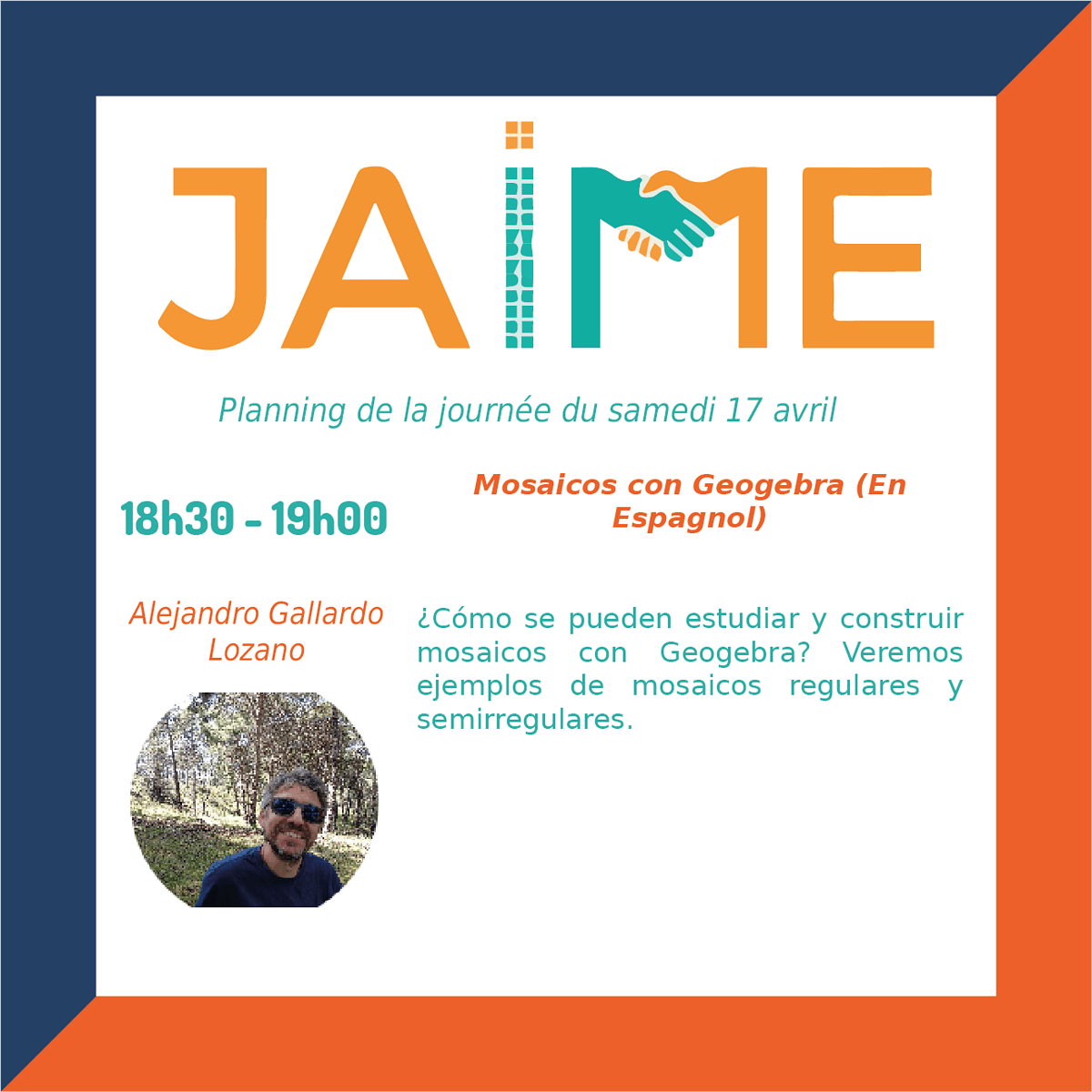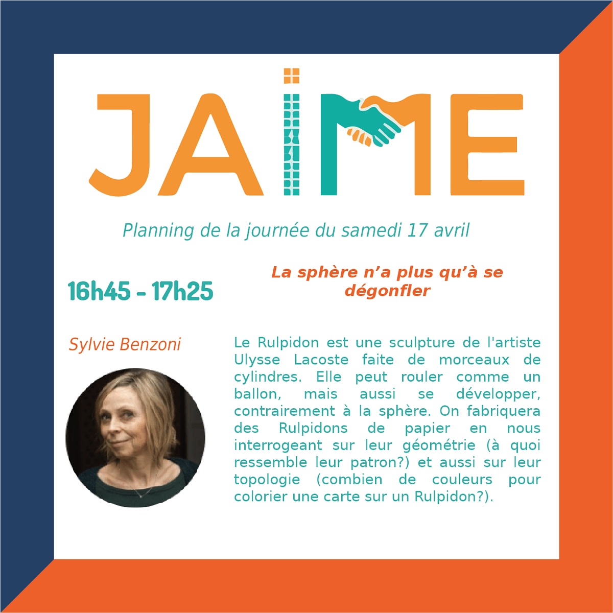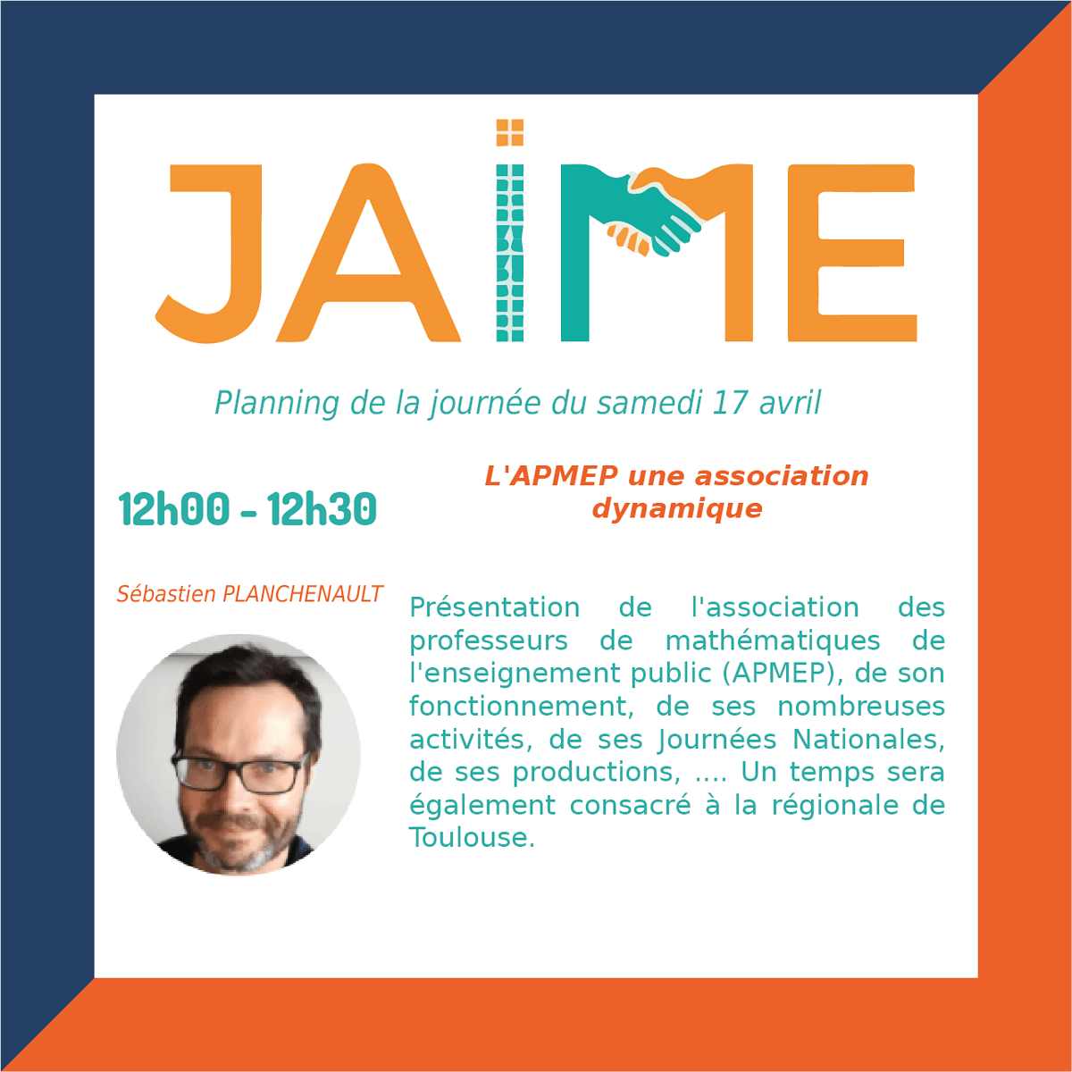 Les journées JAIME (Journées Ateliers Informatiques et Mathématiques pour les Enseignants) auront lieu le samedi 17 avril de 8h30 à 12h30 et de 13h30 à 20h et dimanche 18 avril 9h à 12h35 et de 13h30 à 17h30, pour clore le Festival international « Les maths dans tous leurs états ».