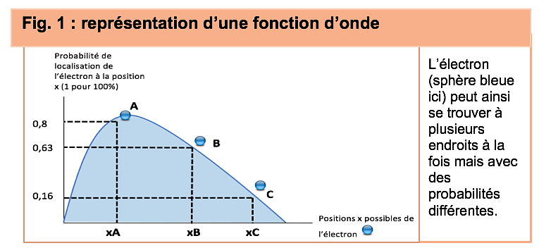 D’un point de vue mathématique, la position de l’électron est « distribuée selon une loi de probabilité » (ou fonction d’onde). En d’autres termes, l’électron a 80% de chance d’être en xA, mais aussi 63% de chance d’être en xB et 16% de chance de se trouver en xC : l’électron ne peut donc pas être localisé en un point précis de l’espace et peut être à plein d’endroits différents.