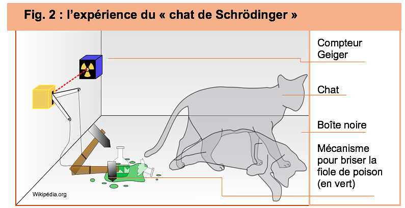 Dans cette expérience, un chat, est enfermé dans une boîte noire, à l’abri des regards (ne permettant donc pas aux expérimentateurs de voir ce qui se passe à l’intérieur) avec une source de radioactivité (des noyaux d’atomes radioactifs). Un compteur Geiger permet de mesurer le niveau de radioactivité émise dans la boîte et est relié à un mécanisme pouvant briser une fiole contenant un gaz mortel (mécanisme dépendant du niveau de radioactivité mesuré par le compteur) (Fig.2).