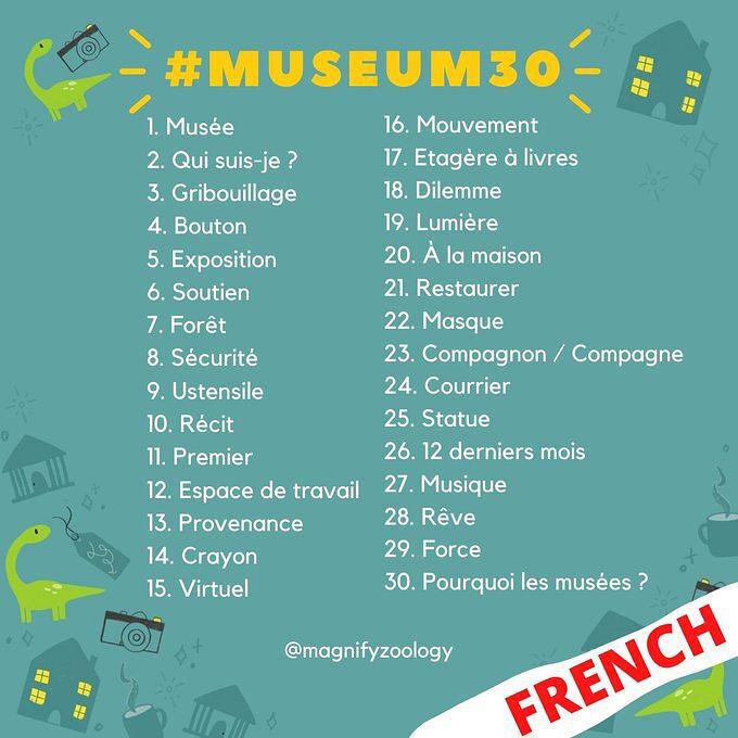 Un autre challenge international se rajoute depuis quelques années à ces initiatives : le #Museum30 :  lancé en 2017 par Gracie Price (alias @magnifyzoology), étudiante anglaise en archéologie et études muséales, c’est la 4ème édition de ce challenge que vous pouvez suivre sur plusieurs réseaux sociaux pendant tout le mois de novembre 2020, sur Instagram, Facebook, Twitter. C'est  d'ailleurs sur ce dernier social média que la participation est la plus active, avec une forte part de musées anglais.