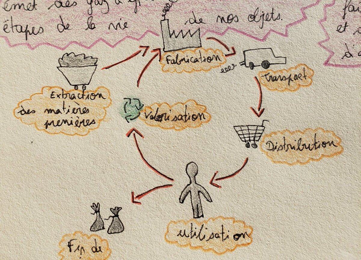 Une fois le retour collectif de réalisé, nous prenons le temps de répondre aux interrogations que la vidéo a suscité. L’atelier se poursuit à l’oral avec les différentes étapes du cycle de vie de l’objet à savoir :