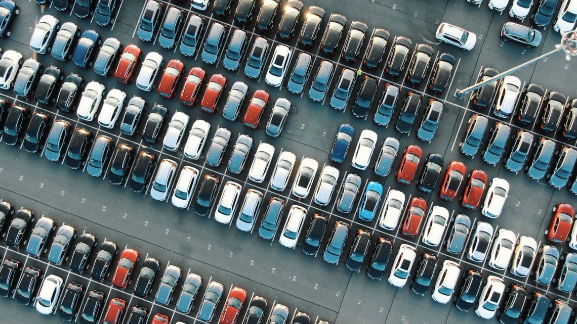 Tight coloured finished car rows on warehouse parking area with modern lighting on sunny summer day vertical upper view