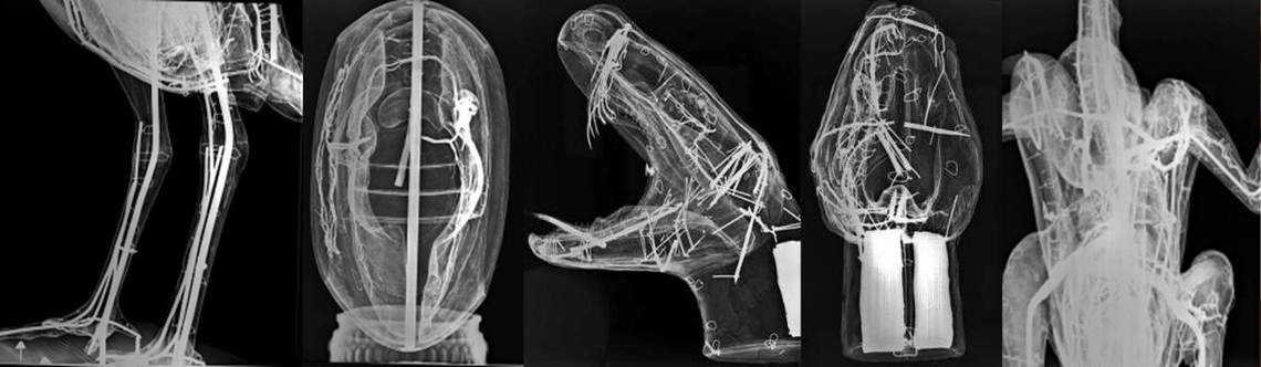 Qu’il s’agisse d’un tableau, d’un objet ou de mobilier, tout peut donc être radiographié. Pour les peintures, la radiographie peut révéler des informations sur le support et les dessins préparatoires tandis que pour un objet, on pourra voir sa structure interne et les traces d’anciennes restaurations. Ainsi les radiographies révèlent ce qui est invisible à l’œil nu. Elles donnent des informations primordiales sur les matériaux, leur modélisation, leur structure et les éventuels ajouts et modifications qui ont pu être faits. C’est dans cette optique que les modèles anatomiques du Dr. Auzoux ont été radiographiés.