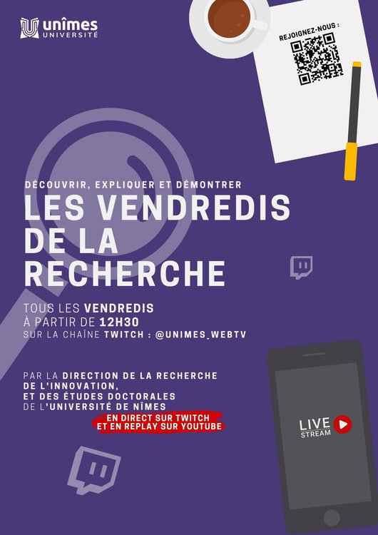 En 2022, la direction de la recherche, de l’innovation et des études doctorales de l'Université de Nîmes propose "les vendredis de la recherche": une heure d'émission live consacrée chaque semaine à la présentation des chercheur.euse.s, de leurs projets de recherche, de leurs parcours professionnel, pour partager la recherche avec le grand public, en alternance avec un format autour de thèmes en lien avec la société, de façon claire et spontanée.