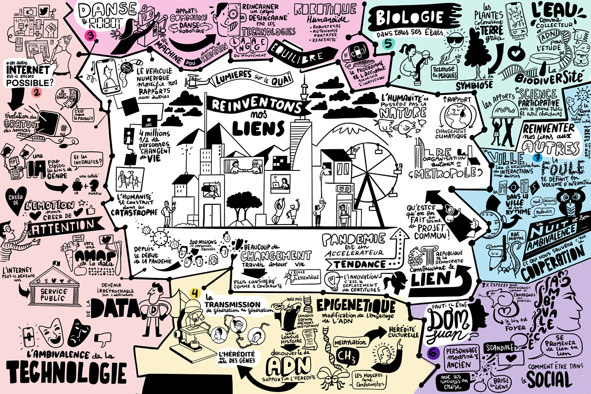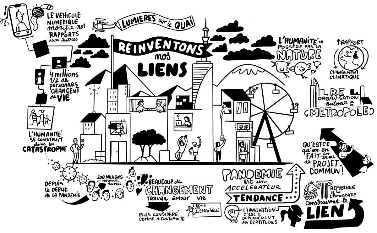 L'édition 2021 du festival Lumières sur le Quai a exploré la thématique "réinventer nos liens" à travers 7 rencontres. Les échanges des intervenantes & intervenants de ces tables-rondes et podcasts, enregistrés en public, sont à retrouver en vidéos sur notre chaîne YouTube et ont été retranscrits en mode scribing par Jan Gunther.