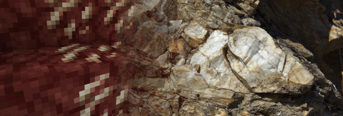 Mais revenons au quartz. Contrairement à la Terre, le minéral est loin d'être le plus facile d'accès dans Minecraft. Il n'est même pas présent dans la dimension de base qu'est la Surface ! Pour aller le dénicher, il faut pénétrer la dangereuse dimension aux allures d'enfer biblique qu'est le Nether. Ici, le minéral, nommé « quartz du Nether », est représenté sous une forme laiteuse et opaque. Un choix esthétique qui permet de bien le démarquer de sa roche-hôte, la Netherrack, de teinte rouge sang. Les gisements de quartz forment généralement des amas de taille variable (4 à 10 blocs), chaque bloc de minerai de quartz pouvant fournir entre 1 et 4 quartz du Nether. Il est à noter que l'appellation de minerai de quartz est ici techniquement abusive, le terme « minerai » étant réservé aux minéraux contenant une substance métallique d'intérêt économique. Cependant, l'utilisation de ce terme dans le contexte du jeu permet au joueur d'identifier immédiatement à quelle catégorie de bloc il appartient et donc quel usage il peut en faire ; il s'agit ici d'une simplification sémantique nécessaire à la compréhension du jeu.