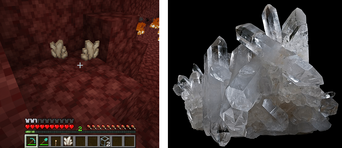 Représentation du quartz après minage dans Minecraft (© Xbox Game Studios, Mojang Studios) comparée à un réel amas de quartz blanc à base hexagonale et à terminaison bipyramidale (Didier Descouens, Wikimedia Commons, licence CC-BY-SA 4.0).