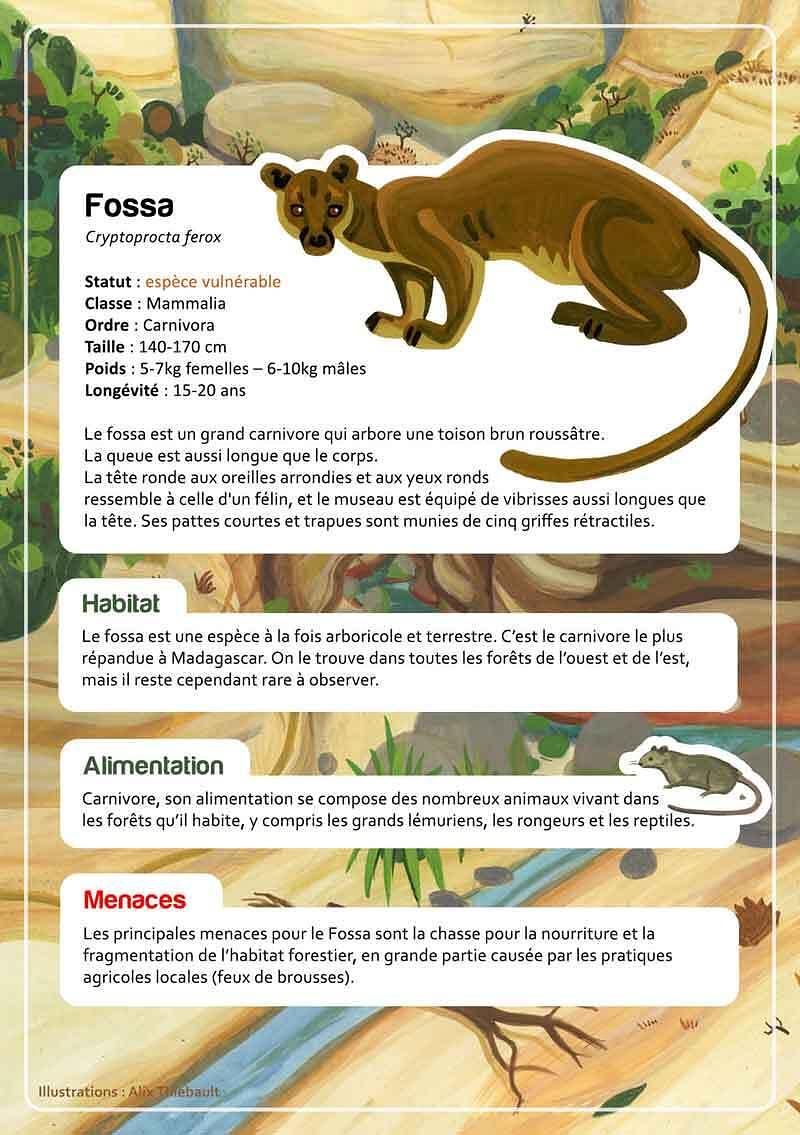 Le Fossa est un mammifère carnivore que l’on trouve uniquement sur l’île de Madagascar. Malheureusement, cette espèce peu connue est considérée comme vulnérable. Elle pourrait passer dans la catégorie des espèces en danger si les facteurs la menaçant persistaient. La plus grande menace étant la destruction de son habitat par l’Homme.