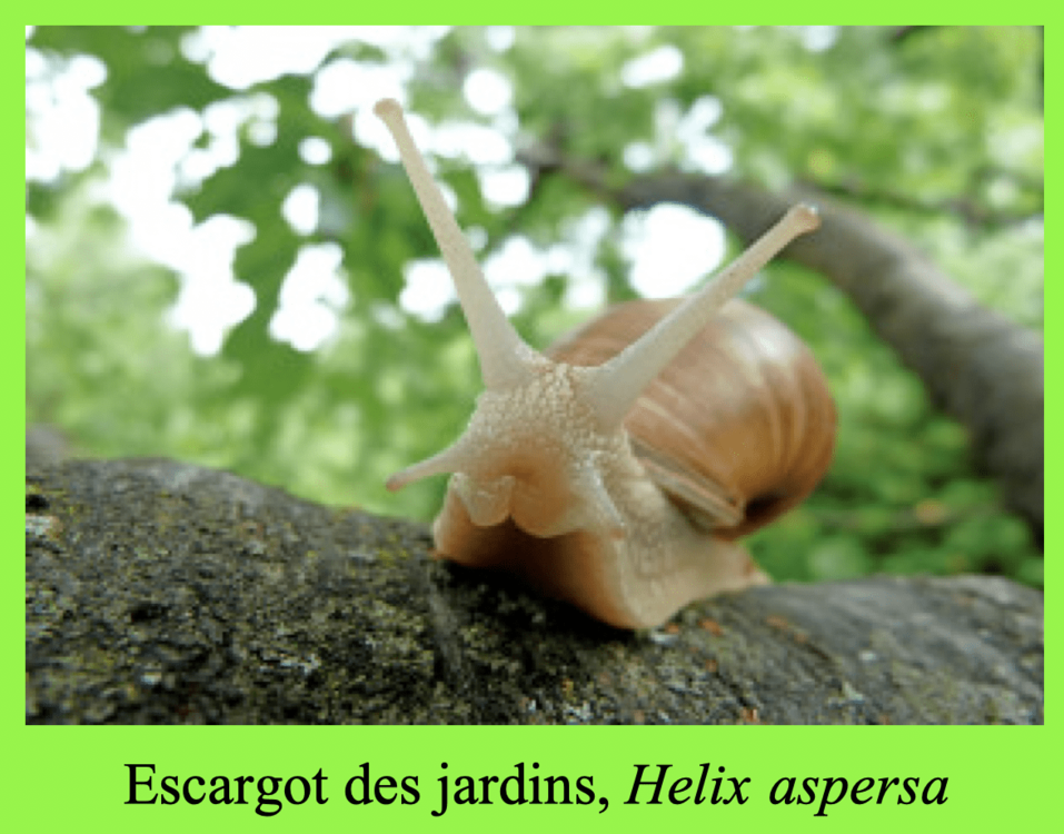 « Ouf ! C’est fait, je suis admis. Bien, mais ce n’est pas tout. Une fois intégré au prestigieux groupe des mollusques, il me reste à me conduire en gastéropode qui se respecte. Moi, en tant qu’escargot, je suis un gastéropode terrestre dit « pulmoné », c’est à dire qui respire de l’air par une sorte de poumon. Mais tout les gastéropodes ne se ressemblent pas : je vous invite à aller à la rencontre de mes cousins méconnus, sujets d’un autre article.»